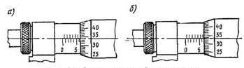 Из приведенного описания устройства микрометра видно, что точность отсчета по микрометру равна 0,001 мм. Но оценивая на глаз интервал между штрихами шкалы барабана, можно повысить точность отсчета до 0,005 мм. Учитывая же неизбежные погрешности, получающиеся вследствие не вполне правильного положения микрометра во время измерения и других причин, погрешность измерения микрометром следует считать в пределах ±0,01 мм.