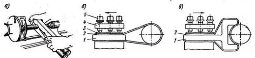Значительное снижение шероховатости поверхности без одновременного повышения ее точности достигается полированием. При тщательной подготовке поверхности резцом, грубым полированием (с применением грубого абразивного полотна зернистостью № 6, 5 или 4 или среднего — зернистостью № 3 и 2) можно довести шероховатость до V7—V8, а, применяя полотна (шкурки) мелкие и отделочные (№ 1, 0, 00, 000), добиваться шероховатости \/10—V11. Полирование обычно ведется с помощью деревянных жимков, охватывающих деталь и прижимающих полотно к ее поверхности (рис. 23, а). Можно вести полирование также по схемам, показанным на рис. 23, б и в. В первом случае деталь, как и в жимках, охватывается лентой абразивного полотна 2. Во втором случае имеет место касание детали по меньшей дуге окружности и нагрев ее уменьшается. Зажимается лента в резцедержателе 4 болтами 5 с помощью державок 1 и зажимной планки 3. Натяжение ленты, а также перемещение ее вдоль оси детали осуществляется соответствующими рукоятками суппорта.