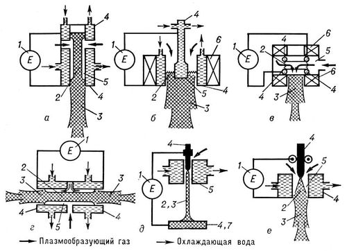 Рис. 1. Схема дуговых плазматронов: а — осевой; б — коаксиальный; в с тороидальными электродами; г — двустороннего истечения; д — с внешней плазменной дугой; е — с расходуемыми электродами (эрозионный); 1 — источник электропитания; 2 — разряд; 3 — плазменная струя; 4 — электрод; 5 — разрядная камера; 6 — соленоид; 7 — обрабатываемое тело.
