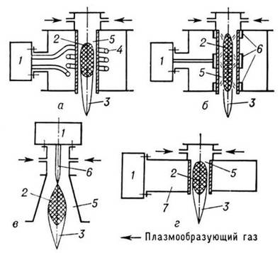 Рис. 2. Схемы высокочастотных плазматронов: а — индукционный; б ёмкостный; в — факельный; г — сверхвысокочастотный; 1 — источник электропитания; 2 — разряд; 3 — плазменная струя; 4 — индуктор; 5 — разрядная камера; 6 — электрод; 7 — волновод