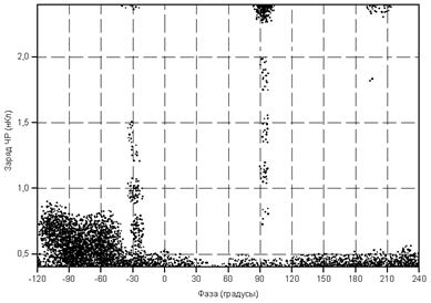 Возьмем лист бумаги и отложим по горизонтальной оси фазу (от нуля до 360 градусов), а по вертикальной оси – амплитуду сигнала. Для каждого зарегистрированного сигнала у нас есть две характеристики – амплитуда и фаза. Будем рассматривать их как две координаты точки на плоскости листа. Каждый зарегистрированный сигнал будем отмечать точкой, поставленной в соответствии с измеренными значениями амплитуды и фазы импульса. После достаточно длительного измерения, мы получим картину похожую на приведенную на рис. 2 (реальные данные). Это и есть АФД с точечной формой представления данных.
