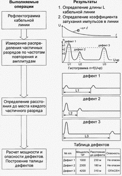 Сущность метода измерения частичных разрядов заключается в следующем. В момент появления частичного разряда в кабельной линии возникает два коротких импульсных сигнала, длительности которых десятки-сотни наносекунд. Эти импульсы распространяются к разным концам кабельной линии. Измеряя импульсы, достигшие начала кабеля, можно определить расстояние до места их возникновения и уровень.