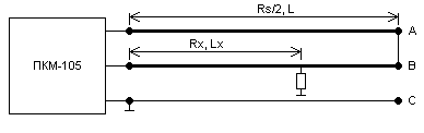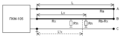 Измерение Lx производится прибором ПКМ-105 (РЕЙС-205) автоматически. Причем под управлением встроенного микропроцессора сначала измеряется сопротивление Rs шлейфа жил A и B, а затем измеряются сопротивление Rx части шлейфа от начала кабеля до места понижения изоляции жилы B.