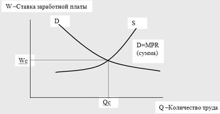 Как и всякий рынок, рынок труда имеет законы образования цены на труд. Рассмотрим, как образуется эта цена на чисто конкурентном рынке труда. Для него характерны большие количества независимых фирм (организаций), конкурирующих между собой при найме многочисленных рабочих, имеющих одинаковую (или почти одинаковую) квалификацию, и при этом ни фирмы, ни рабочие не осуществляют контроль над рыночной ставкой заработной платы. А так же, как и при любом другом конкурентном рынке, равновесная цена (в случае заработная плата) является точкой пересечения кривых спроса и предложения. Из этого следует, что для выявления равновесной заработной платы нужно выяснить, как формируются кривые спроса и предложения на этом рынке.