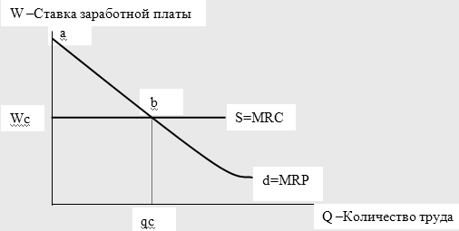 На практике каждая фирма на рынке нанимает очень малое количество рабочих по сравнению с общим количеством нанятых рабочих, поэтому ни одна из фирм не может влиять на ставку заработной платы. Из этого следует, что кривая предложения для отдельной фирмы будет совершенно эластична (рисунок 1.2): Поскольку для отдельной конкурентной фирмы задана ставка заработной платы, то предельные издержки на данный ресурс (MRC) будут постоянны и равны ставке заработной плате.