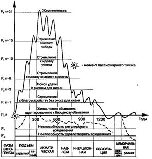 Обратим внимание на график. Это график, изображающий зависимость пассионарности этнической системы от времени её существования.