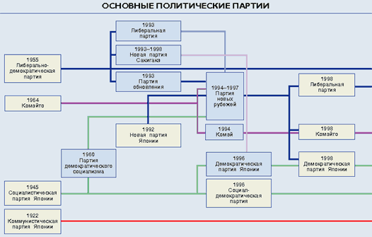 Япония — конституционная монархия. Согласно Конституции, вступившей силу 3 мая 1947 года, император Японии — «символ государства и единства народа», все государственные назначения и решения он производит по представлению Кабинета министров, который и несёт за них ответственность. На дипломатических встречах он играет роль главы государства. С 1989 года императором Японии является Акихито, ему наследует принц Нарухито. К началу ХХ1 в. в политической жизни Японии заметную роль играют шесть крупных политических партий: Либерально-демократическая партия, Демократическая партия, Комэйто, Либеральная партия, Коммунистическая партия Японии и Социал-демократическая партия.