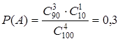 Загальне число можливих наслідків випробування дорівнює числу способів, якими можна витягнути 4 деталі зі 100. Підрахуємо число наслідків, що сприяють нашій події. Три стандартні деталі з 90 можна витягнути способами, а одна бракована деталь, що залишилася, може бути витягнута з 10 бракованих деталей способами. Отже, число наслідків, що сприяють нашій події, дорівнює: Тоді шукана ймовірність дорівнює відношенню числа наслідків, що сприяють події, до числа всіх елементарних наслідків: