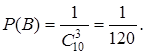 На відміну від попередньої задачі число можливих наслідків експерименту обчислимо як число можливих сполучень з 10 по 3, оскільки порядок появи елементів не відіграє ролі, тобто елементи можна поміняти місцями. Шукана ймовірність: