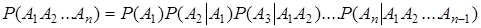 Ймовірність спільної появи декількох подій дорівнює добутку ймовірності однієї з них на умовні ймовірності всіх інших, причому ймовірність кожної подальшої події обчислюються в припущенні, що всі попередні події вже відбулися:
