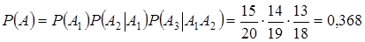 Студент прийшов на екзамен, знаючи 15 з 20 запитань програми. Знайти ймовірність того, що він знає відповіді на всі три запропоновані йому екзаменатором запитання.