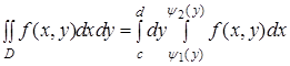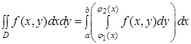 Тут внутрішнім є інтеграл за змінною . Обчислюючи його в межах від до (при цьому вважається сталою), отримаємо деяку функцію від однієї змінної . Інтегруючи потім цю функцію в межах від до , отримаємо значення подвійного інтеграла.