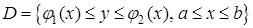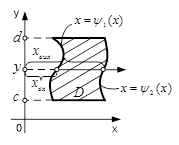 Це і є шукана формула для обчислення подвійного інтеграла. Праву частину формули (10) називають повторним інтегралом від функції за областю . У повторному інтегралі (10) інтегрування виконується спочатку за змінною (при цьому вважається сталою), а потім за змінною . Інтеграл за змінною називають внутрішнім, а за змінною - зовнішнім. У результаті обчислення внутрішнього інтеграла (в межах від до ) одержуємо певну функцію від однієї змінної . Інтегруючи цю функцію в межах від до , тобто обчислюючи зовнішній інтеграл, отримаємо деяке число - значення подвійного інтеграла. Зауваження Наведені геометричні міркування при одержанні формули (10) можливі у випадку, коли . Проте формула (10) залишається справедливою і в загальному випадку. Зауваження 2. Якщо область обмежена двома неперервними кривими і двома прямими причому для всіх , тобто якщо область правильна в напрямі осі