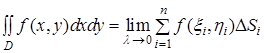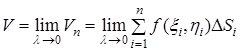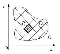 Нехай функція визначена в замкненій обмеженій області . Вважатимемо, що межа області складається із скінченного числа неперервних кривих, кожна з яких визначається функцією виду або . Розіб'ємо область на частини ,які не мають спільних внутрішніх точок і площі яких дорівнюють , . У кожній області візьмемо довільну точку і утворимо суму