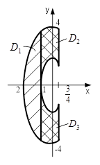 Зауваження 4. Якщо область не є правильною ні в напрямі осі ,ні в напрямі осі (тобто існують вертикальні і горизонтальні прямі, які, проходячи через внутрішні точки області, перетинають її межу більше, ніж у двох точках), то таку область необхідно розбити на частини, кожна з яких є правильною областю у напрямі чи . Обчислюючи подвійні інтеграли по правильних областях і додаючи результати (властивість адитивності), знаходимо шуканий подвійний інтеграл за областю . Для випадку, зображеного на рис.6 (область обмежена еліпсами і прямою ), при інтегруванні в напрямі осі маємо