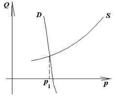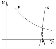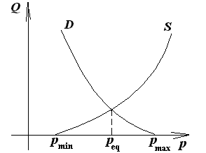 В экономике, переживающей фазу кризиса, спад физических объемов производства сужает границы применения машин, поэтому производителю информации становится невыгодно ее производить, а потребителю — ее потреблять, применять в производстве. Это значит, что в период кризиса обе кривые (спроса и предложения) на рисунке 1 «опускаются» и принимают положение, изображенное на рисунке 2. Заметим, что при этом нижний предел цены информационного продукта (цена производителя pmin