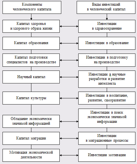 - человеческий капитал состоит из ряда компонентов, каждому компоненту соответствует свой вид инвестиций;