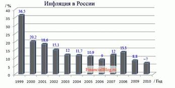 Экономика современной России реально столкнулась с серьезными инфляционными проблемами в начале 90-х годов, в условиях шокового перехода России к рыночной экономике. Зарождавшиеся инфляционные процессы в нашей стране были обусловлены диспропорциями в сложившейся структуре народного хозяйства. В России в то время инфляция сочеталась одновременно со спадом производства, т.е. происходила стагфляция. Это был длительный период инфляционного кризиса в России. Лишь благодаря введениювалютного коридораи других мер по укреплению национальной валюты в 1996 г. правительству удалось снизить уровень инфляции. Кризис 1998 г опять привел к росту инфляционных показателей. Фактически в период с 1995 г. по 2005 г. в России сохраняласьгалопирующая инфляция,уровень которой колебался от 10 до 84%.