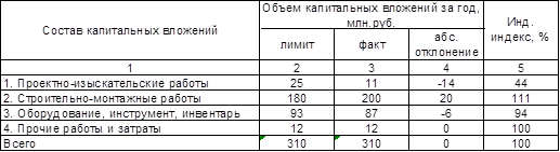 Из табл. 1 видно, что удельный вес капитальных вложений по строительно-монтажным видам превысил планируемый, тогда как объём капитальных вложений по проектно-изыскательским работам и оборудованию оказался меньше лимита.