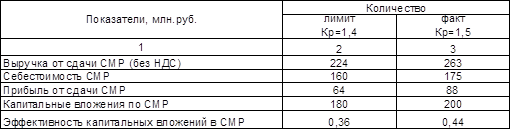 Исходя из данных табл. 4 можно сделать вывод о том, что капитальные вложения в строительно-монтажные работы оказались эффективнее, чем планировались. При этом коэффициент реализации оказался равным Кр=1,5 (планировалось Кр=1,4). Эффективность капитальных вложений в СМР была запланирована как 0,36, фактически же она составила 0,44 (превысила на 8%), что означает, что на 1 рубль капитальных вложений прибыль составить 44 копейки. Это говорит о высокой эффективности капитальных вложений.