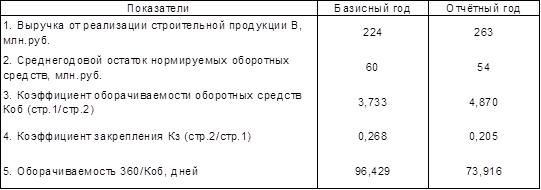 Из табл. 18 видно, что коэффициент оборачиваемости в отчётном году больше, чем в базисном, а значит, ускоряется оборачиваемость оборотных средств, т.е. эффективность использования оборотных средств улучшается.