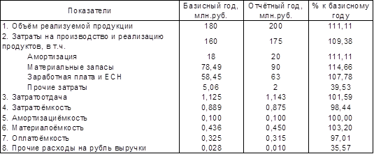 1) Выручка от реализации продукции, работ и услуг в отчётном году увеличилась по сравнению с базисным (соответственно 200 и 180 млн.руб.)