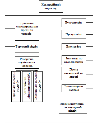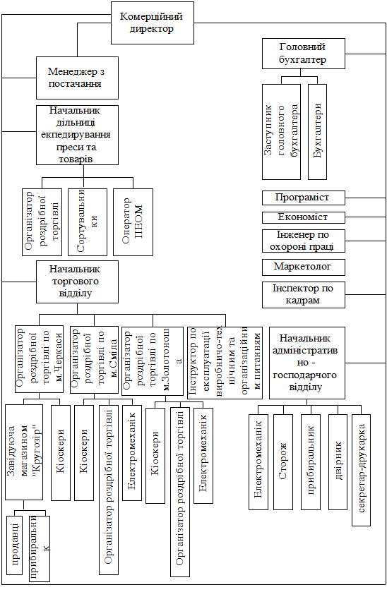 Отже, Центр ”Торгпреса” сполучає в собі елементи функціональної та дивізіональної форми структури організації. Функціональний компонент тут звернений на проблеми раціонального управління постачанням друкованої продукції та товарів народного споживання, а також управління запасами, дивізіональний компонент сконцентрований на сервісі і ринках[21].