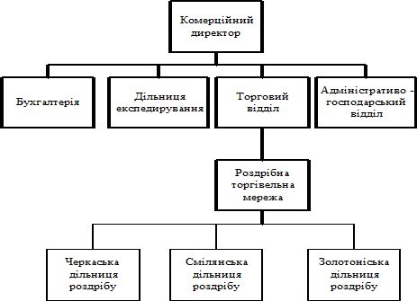 Але оскільки торгові точки організації охоплюють три міста Черкаської області, то поділ організації на елементи і блоки відбувається за територіальним принципом, тобто за місцем розміщення ії підрозділів. Організація в даному випадку побудована на не повністю за територіальним принципом, так як вона не включає інших процесів, окрім збуту. В даному випадку чисто функціональна структура виявляється не досить ефективною, тому організація переходить до використання дивізіональних структур, що орієнтовані або на різні види продукції, або на різні групи споживачів, або на різні регіони. Вибір на користь тої чи іншої структури визначається важливістю цього елементу в стратегічних планах організації.