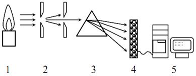 Рис. 3. Принципиальная схема многоканального атомно-эмиссионного спектрофотометра: 1 – горелка, 2 – входная щель, 3 – призма, 4 – диодная линейка, 5 – регистратор
