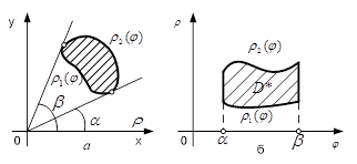 ) обмежена променями, які утворюють з полярною віссю кути та  і кривими та  , то полярні координати області змінюються в межах , (рис.1, б). Тому формулу (4) можна записати у вигляді
