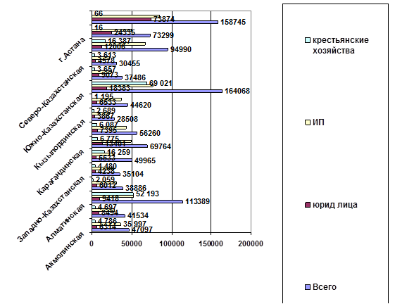 Следует отметить, что г. Алматы занимает первое место по образованию юридического лица, индивидуального предпринимательства – во всех прошедших годах и настоящего года. По образованию крестьянских (фермерских) хозяйств первое место занимает Южно – Казахстанская, также во всех годах, приведённых в таблице.