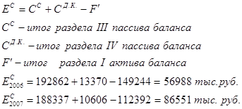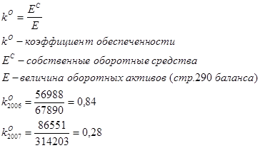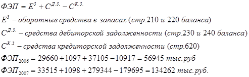 Анализ обеспеченности собственными оборотными средствами показал, что предприятию присуще нехватка собственных оборотных средств. Наличие собственных оборотных средств на предприятии в 2006г. составило 56988 тыс. руб., а в 2007г. 86551 тыс. руб. При этом ФЭП в оборотных средствах в 2006г. составила 14% (56945 тыс. руб.) от средней выручки от продаж, а в 2007г. ситуация ухудшилась и составила 25% (134262 тыс. руб.). Из этого видно, предприятие в 2006г. было обеспечено собственными оборотными средствами на 84%, что является очень высоким показателем, а в 2007г. ситуация ухудшилась и коэффициент обеспеченности собственными оборотными средствами упал до 28%.