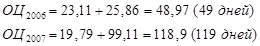 Снижение периода оборота производственных запасов на 3 дня привело к увеличению ОЦ до 46 дней (на 3 дня по сравнению с 2006г.). Увеличение срока оборота дебиторской задолженности на 73 дня привело к росту длительности ОЦ на 73 дня.