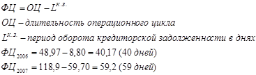 В 2007 году по сравнению с 2006 годом операционный цикл увеличился на 70 дней. Данный показатель является отрицательной характеристикой производства. Поскольку при увеличении длительности операционного цикла, при прочих равных условиях, увеличивается время между закупкой сырья и получением выручки, вследствие чего снижается рентабельность.