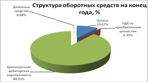 По результатам проведенного анализа структуры и динамики оборотных активов можно сказать, что в целом предприятию наблюдается существенный рост объема оборотных активов, прирост составил 246312 тыс. руб. В первую очередь, данный показатель достигнут за счет значительного увеличения дебиторской задолженности, роста денежных средств и объема запасов.