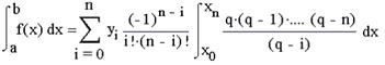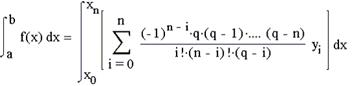 де q=(x-x0) /h – крок інтерполяції, замінимо підінтегральну функцію f(x) інтерполяційним багаточленом Лагранжа: