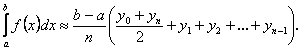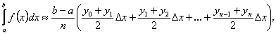 Формула (3) називається формулою трапецій. Число n вибирається довільним, але чим більшим це число буде, а значить, крок меншим, тим з більшою точністю сума в правій частині наближеної рівності (3) буде давати значення інтегралу.