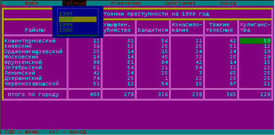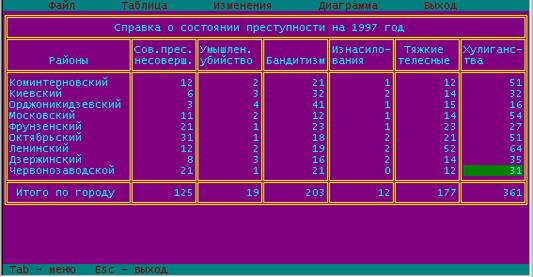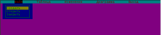 Для просмотра диаграммы данной таблицы, необходимо войти в меню, выбрать пункт Диаграмма и нажать Enter. После этих действий на экране появится диаграмма, с помощью которой можно визуально просмотреть данные таблицы.