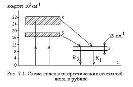 Вследствие взаимодействий между ионами кристаллической решетки основное состояние расщеплено на ряд уровней. Схема нижних энергетических уровней приведена на рис. 7.1. Два близко расположенных уровня 2 - метастабильные долгоживущие состояния. Время жизни данного состояния в квантовой механике определяется суммой вероятностей всех спонтанных переходов в низшие состояния 1