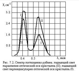 Спектр поглощения рубина соответствует раздвоенной структуре состояния 3. Он содержит две широкие (Dl»1000 ) полосы поглощения, максимумы которых приходятся на зеленую и фиолетовую области спектра. Спектр поглощения рубина представлен на рис. 7.2, где две зависимости соответствуют двум ориентациям падающего излучения относительно оптической оси кристалла. В результате поглощения излучения накачки ионы хрома переходят в одно из состояний 3. Затем за счет спонтанного безизлучательного распада этих состояний ионы оказываются в метастабильных состояниях 2. Поскольку в данном случае выполняется условие населенность состояния 2 при соответствующей плотности накачки может превысить населенность невозбужденного состояния и на переходах 2 ® 1 возникает генерация. В рубиновом ОКГ генерация осуществляется на двух линиях, которые обычно обозначают R1