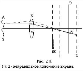 Чаще в качестве объектива О используется один из двух шлирен-объективов, когда оптическая неоднородность помещается на пути параллельных пучков света (рис. 2.3). В последнем случае плоскость расположения оптической неоднородности и плоскость экрана являются сопряженными относительно объектива К. При малых углах отклонения света в оптической неоднородности можно считать, что даже после ее введения изображение плоскости s на экране Э остается идентичным изображению, проектируемому невозмущенным пучком света. На рис. 2.3 приведен ход луча, проходящего через точку А при отсутствии неоднородности (сплошная линия) и в случае наличия неоднородности, когда он получает малое отклонение (пунктирная линия). В обоих случаях луч попадает в одну и ту же точку экрана А`. Заметим, что сплошная и пунктирная линии пересекают плоскость изображения источника света, где находится нож, в разных точках, т.е. каждый луч удален от края ножа на различные расстояния а`. Если же экран расположен неправильно (положения экрана 1 и 2, проведены пунктиром), то лучи, отмеченные сплошной линией и пунктирной линией, не попадают в одну и ту же точку экрана, что создает теневой эффект от шлиры. Следовательно, для правильной установки экрана необходимо определить такое положение экрана, в котором при убранной диафрагме оптическая неоднородность не видна. Конечно, сильные оптические неоднородности могут быть несколько заметны и при не правильном положении экрана, например, плоский фронт кинетического пламени, или когда оптическая неоднородность имеет значительную глубину.