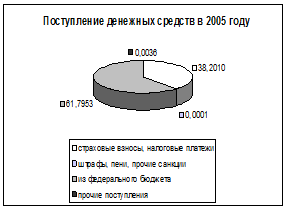 Если проранжировать поступления по удельному весу, то в 2001, 2002, 2003, 2004 годах на первом месте оказались поступления от страховых взносов и налоговых платежей, их доля колеблется от 99,39% до 99,59%, но в 2005 году ситуация кардинально изменилась и первое место заняли поступления из федерального бюджета, что составило 61,80% всей суммы и только на втором месте оказались поступления от страховых взносов и налоговых платежей – 38,20%.
