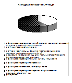 Статьи расходов средств федерального фонда обязательного медицинского страхования более разнообразны, чем поступления. Здесь проглядываются три основных направления затрат. На первом месте с большим преимуществом оказываются расходы, связанные с затратами на реализацию мер социальной поддержки отдельных категорий граждан по обеспечению лекарственными средствами, их доля составляет 51,75%, на втором же месте находятся расходы средств федерального фонда обязательного медицинского страхования, предназначенные на субвенции территориальным фондам (40,93%), а третье место занимают расходы на субсидии территориальным фондам на обязательное медицинское страхование неработающего населения (детей), их доля составляет 6,64%. Остальные же статьи расходов практически не существенны по сравнению с первыми тремя. Но все же в 2005 году имеют место расходы средств федерального фонда обязательного медицинского страхования на финансирование целевых программ обязательного медицинского страхования и отдельных мероприятий по здравоохранению, на финансирование расходов по науке и научному обслуживанию, на финансирование расходов на образование, на финансирование исполнительной дирекции Фонда, на финансирование расходов по созданию и совершенствованию информационной системы Фонда, также на прочие расходы.