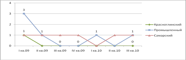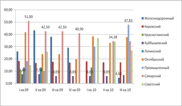 По данным диаграммы видно, что наибольшая стоимость была в Самарском районе. Причем в начале рассматриваемого периода цены были наибольшими, а потом снижались от 52 до 45 тыс.р за кв.м. Далее по ценам идут Железнодорожный, Октябрьский и Советский районы. Колебания цен в них достигали порядка 40% (приблизительно от 25 до 40 тыс.р.). Высокая стоимость в этих районах связана с тем, что они расположены в географическом центре города и имеют хорошую транспортную доступность. Следует отметить и высокую цену в Промышленном районе, но это связано с тем, что в последний период был выставлен на продажу 1 объект высокой стоимости. В остальных районах цены были на уровне 5-18 тыс.р и были достаточно стабильны на протяжении всего рассматриваемого периода.