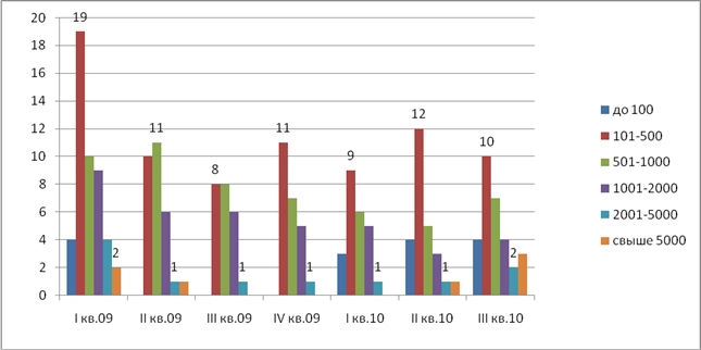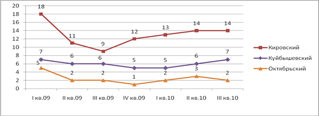 Наибольший объем предложения в Кировском районе, порядка 18 объектов. Это связано с тем, что район находится на окраине города, в промышленной зоне. Далее по объему предложения шли Куйбышевский, Железнодорожный и Октябрьский районы (порядка 6 объектов). В остальных районах объем предложения достаточно мал, а в некоторых вообще равен 0. Наибольший объем приходится на 1 квартал 2009 года, т.е. начало рассматриваемого периода и на 3 квартал 2010, т.е. на конец рассматриваемого периода.