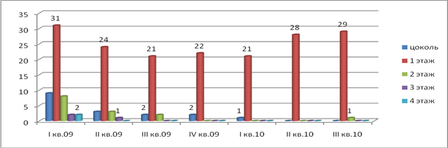 Как видно на диаграмме, наибольшее предложение складов на первом этаже (от 30 до 20 объектов). Так как на первый этаж удобнее погрузить/разгрузить продукцию, в связи с этим многие склады просто состоят из одноэтажного здания. Далее идут цокольные и подвальные помещения (до 8 объектов). В некоторые периоды представлены склады на 2, 3, 4 этажах, но их достаточно мало, это связано с их невостребованностью на рынке.