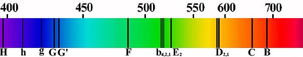 Раскаленная звезда излучает непрерывный спектр, в котором имеются все длины волн. Но излучение, проходя сквозь более холодные слои атмосферы звезды, поглощается, поэтому в спектре появляются темные линии, соответствующие химическим элементам атмосферы. Появление линий поглощения было замечено еще в 1802 году, а двенадцатью годами позже Й. Фраунгофер точно замерил их угловое положение, и сегодня они называются фраунгоферовыми линиями. Так, например, выглядит спектр нашего Солнца.
