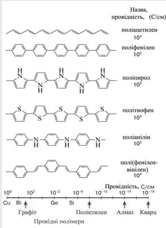 Провідність полімерних матеріалів, що містять електропровідні наповнювачі, може змінюватись в межах десяти десяткових порядків, досягаючи значень від ізоляторів до металів (рис. 1.1.1), ЕПП є одним з найбільш цікавих класів низькорозмірних матеріалів. Основні типи спряжених полімерів наведено на рис. 1.1.1.