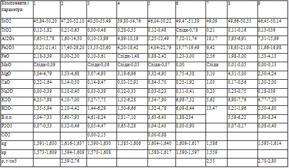 5. Глауконіт - мінерал, класу силікатів групи гідрослюд, до складу якого входять кремній, алюміній, калій, залізо та ін., належить до групи слюд, загального складу (К,Na,Ca)×(Fe3+,Mg,Fe2+,Al)2[(Al,Si)Si3O10] (OH)2×H2O, і містить (%): SiO2 - 44-56; Аl2O3 - 3-22; Fe2O3 - 0-27; FeO - 0-8; MgO - 0-10; K2O до 10%, H2O - 4-10%. Глауконіт вирізняється цілим комплексом унікальних властивостей і використовується як сорбент нафтопродуктів, радіонуклідів і важких металів. Не токсичний.