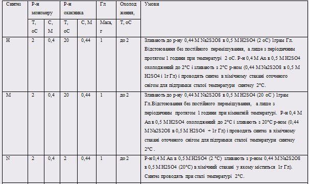 Таблиця Співвідношення між компонентами та умови синтезу модифікованого ПАн/Гл-9.